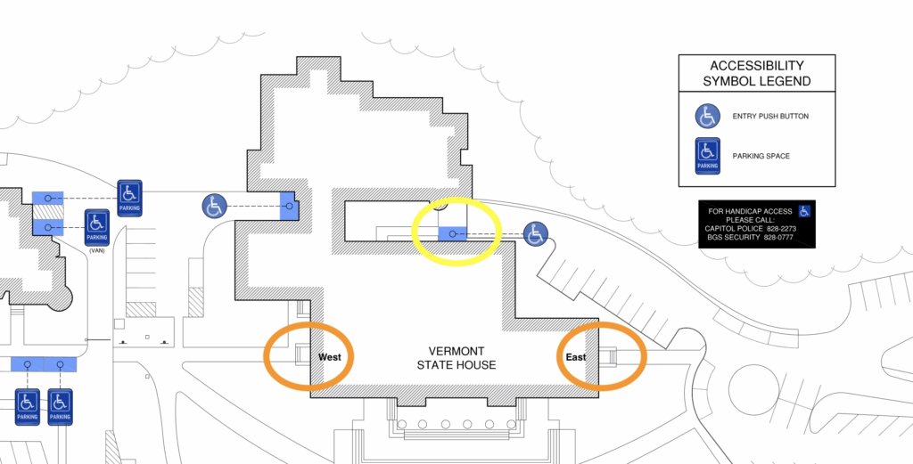 Entrances: The entrance that we can guarantee will be open is the one circled in yellow in the map below. This entrance (which is accessible) is tucked behind the main building, between it and the extension to the back. The east and west entrances, circled in orange, are also likely to be open; these are on the left and right ends of the main building.